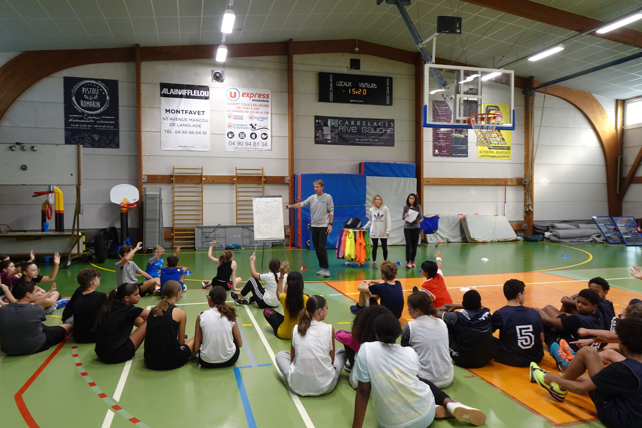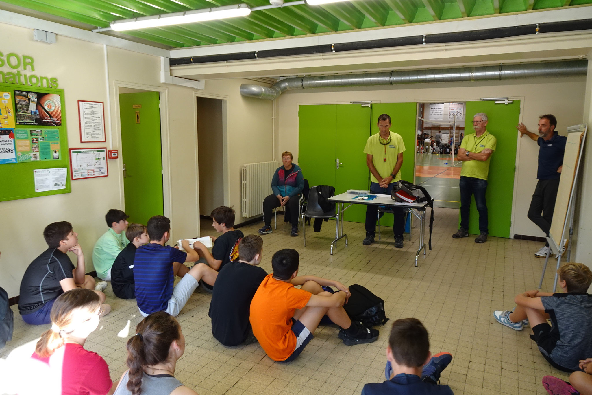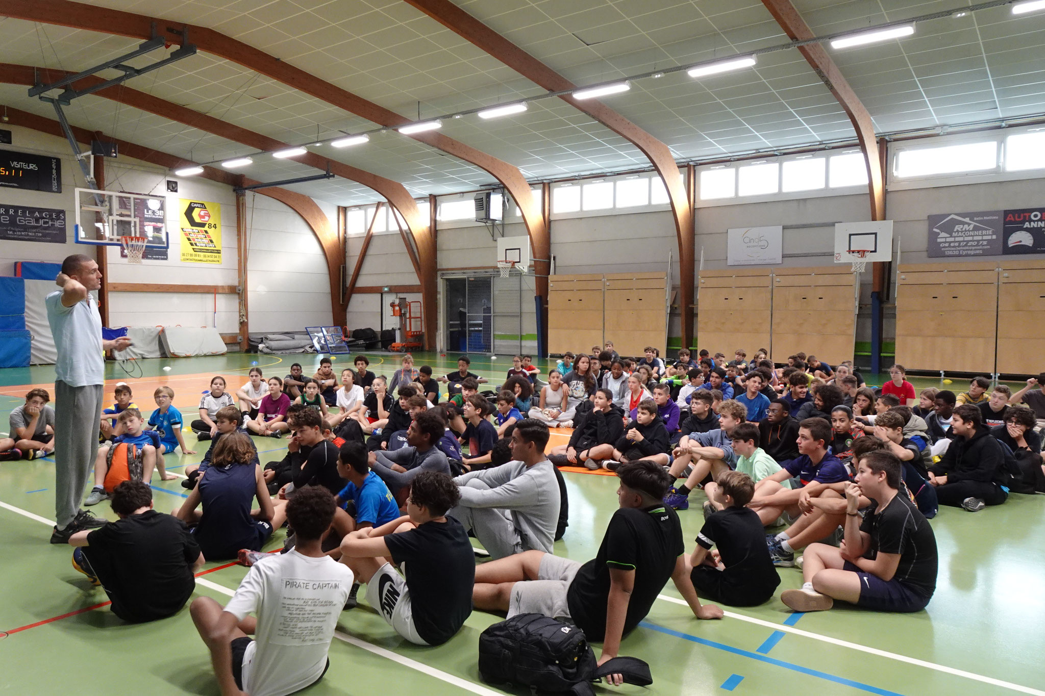 Ci-dessous, les photos de l'accueil des jeunes à cette journée et le "briefing" sur le règlement dans chaque sport représenté : basket, volley, rugby et football.